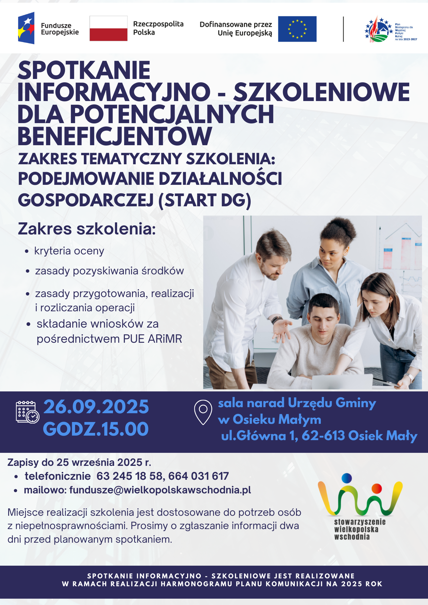 Spotkanie informacyjno - szkoleniowe dot. zasad pozyskiwania środków w ramach naboru nr 582715 z zakresu podejmowania działalności gospodarczej START DG